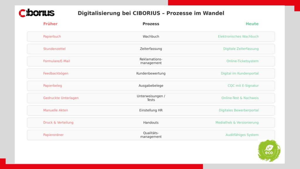 Bei CIBORIUS ist Digitalisierung kein Trend, sondern gelebte Praxis. Bereits über 85 % unserer internen und externen Abläufe sind digitalisiert – ein Meilenstein, der nicht nur Effizienz steigert, sondern auch unseren ökologischen Fußabdruck reduziert.